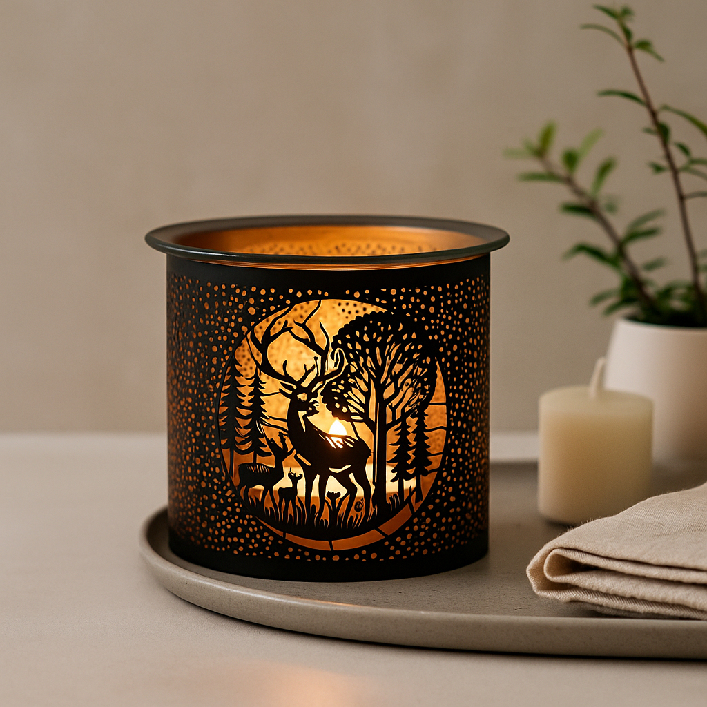A striking, nature-inspired centrepiece that brings warmth and atmosphere to any space. This Black Deer Family Metal Tealight Burner features a detailed woodland silhouette cut from high-quality metal, creating a stunning shadow effect when a candle is lit behind it.
